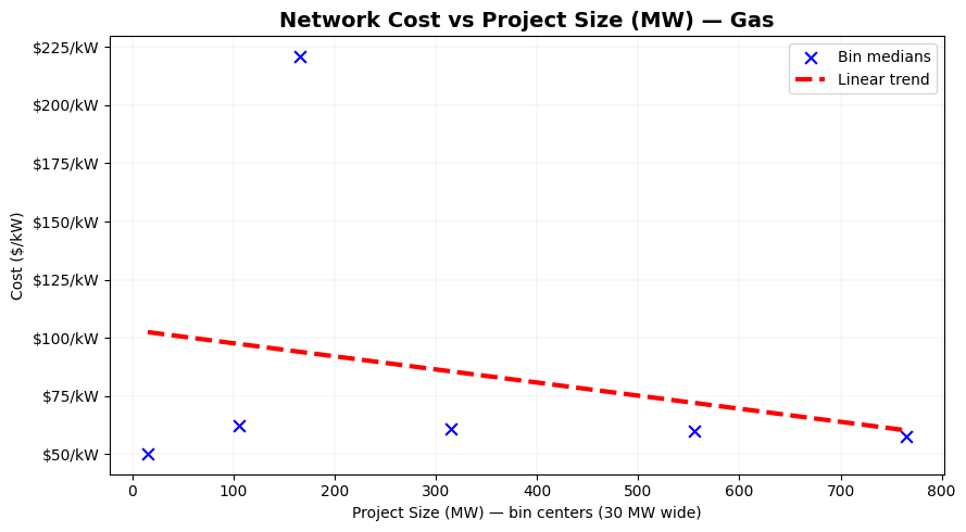 - Gas generation has low network costs and relatively consistent (or slightly improving) with project size.