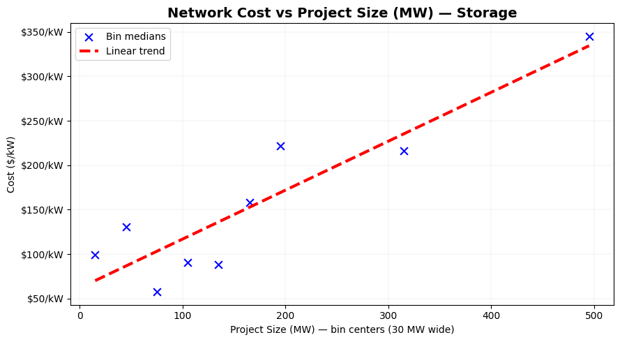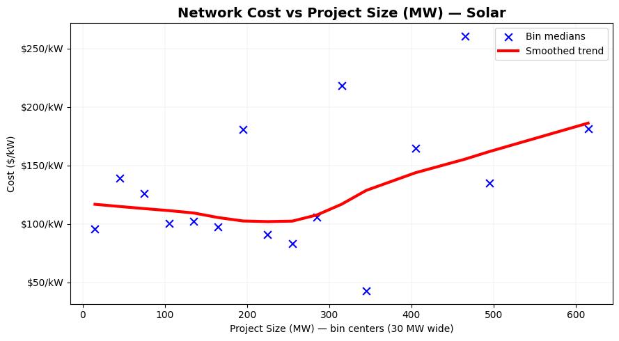 - Solar generation has less discernable trends. It has higher network costs. At larger project sizes the interconnection cost is highly variable and can be quite high.