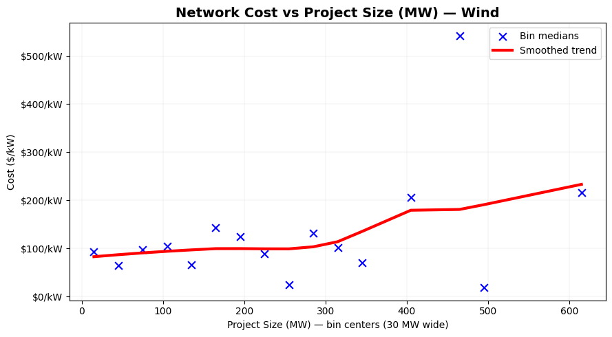 - Wind generation has moderate costs, but faces higher costs as the project size increases